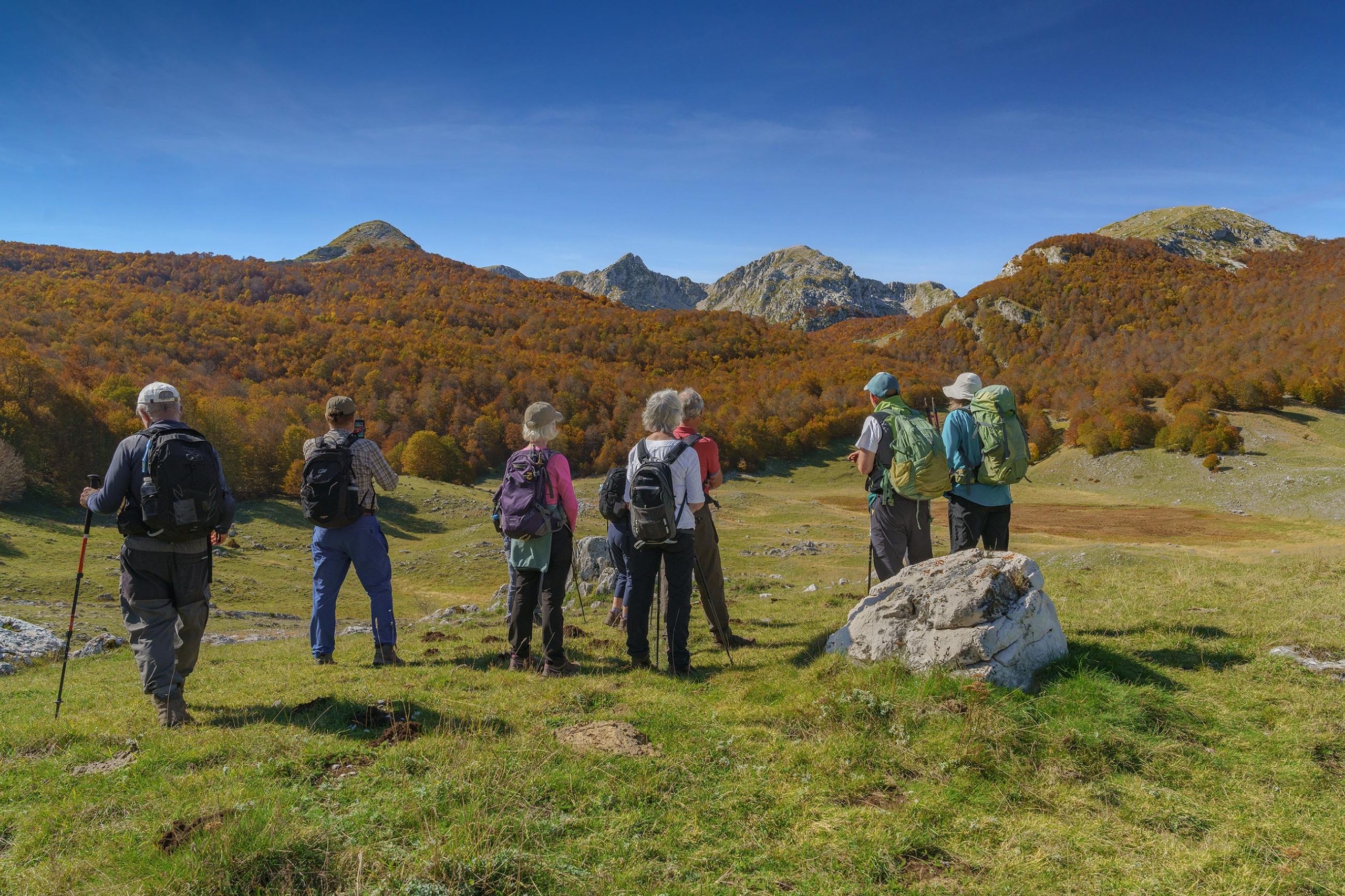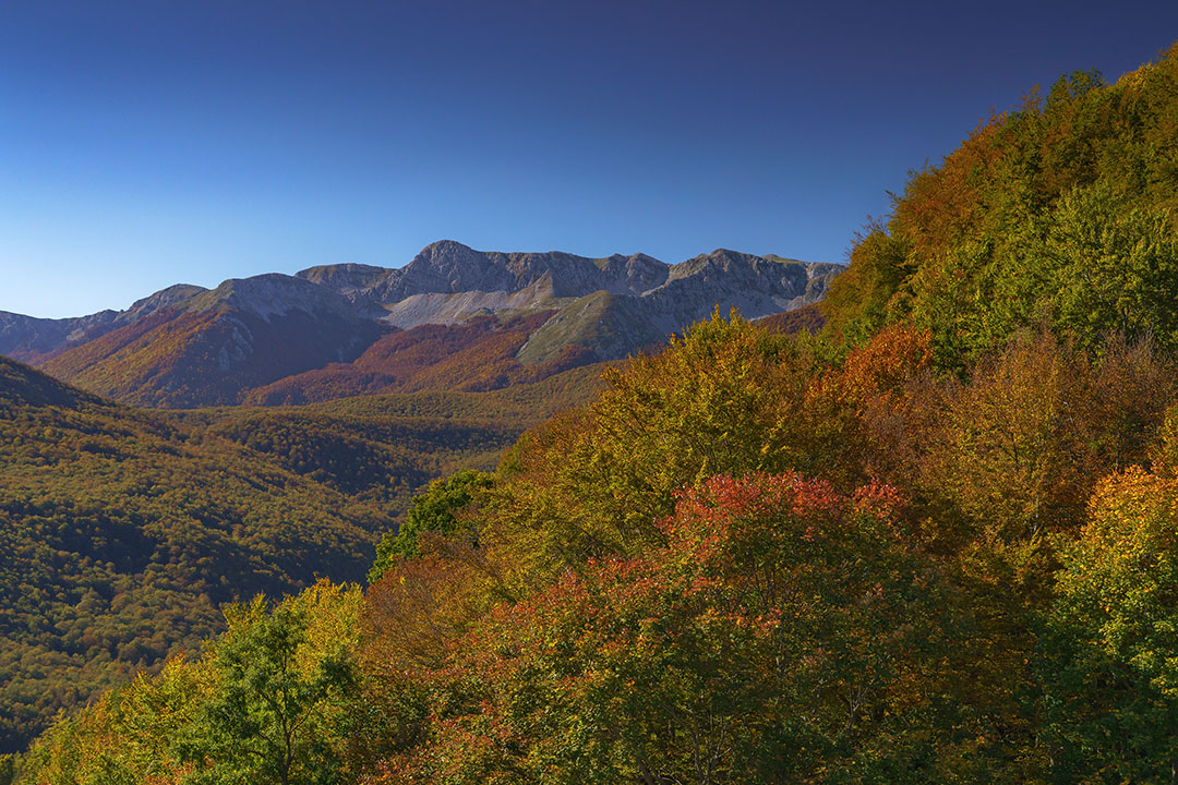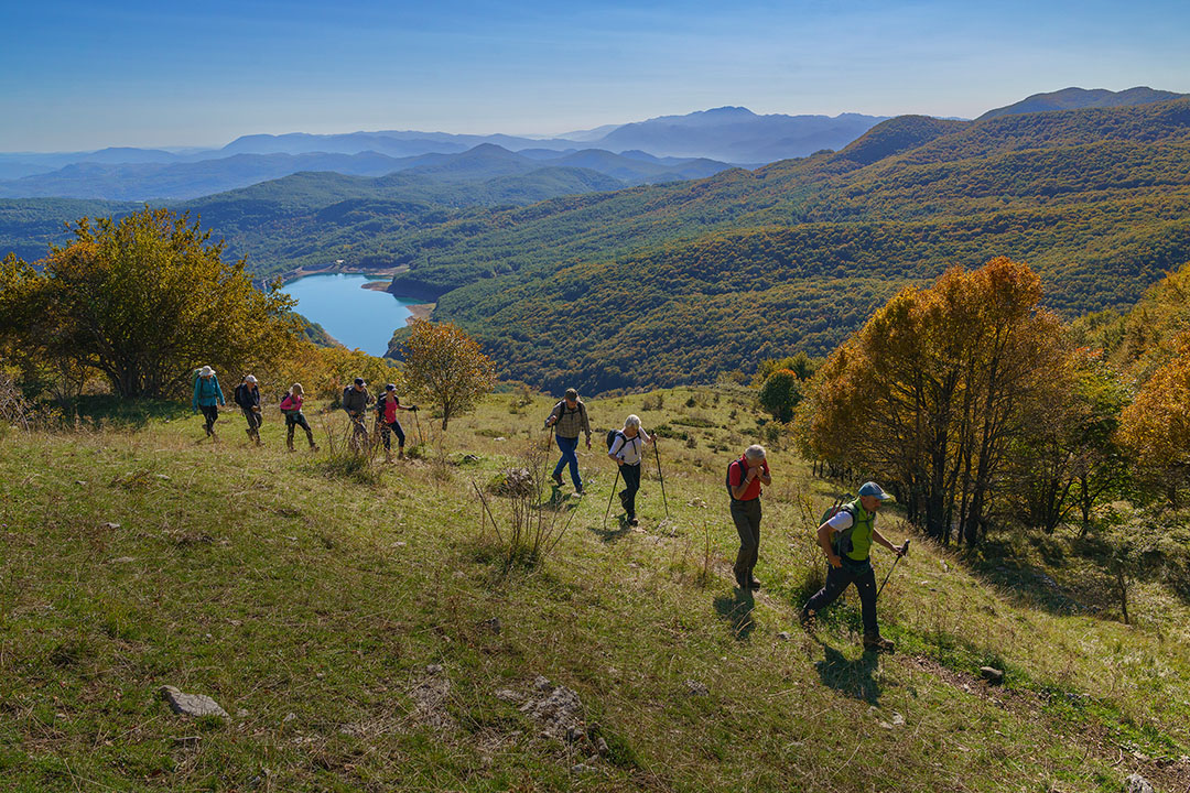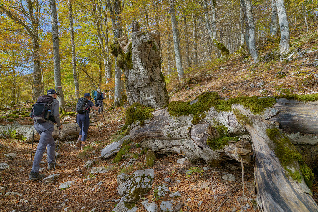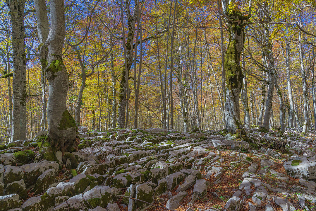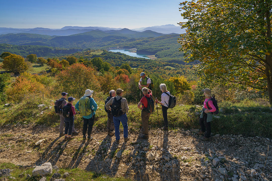 L’escursione sale nella faggeta della Valle dell’Inferno, dove il bosco autunnale si accende di gialli, rame e ocra, e dopo circa due ore raggiunge la conca carsica del Lago Vivo, incastonata tra montagne rocciose e faggi secolari.