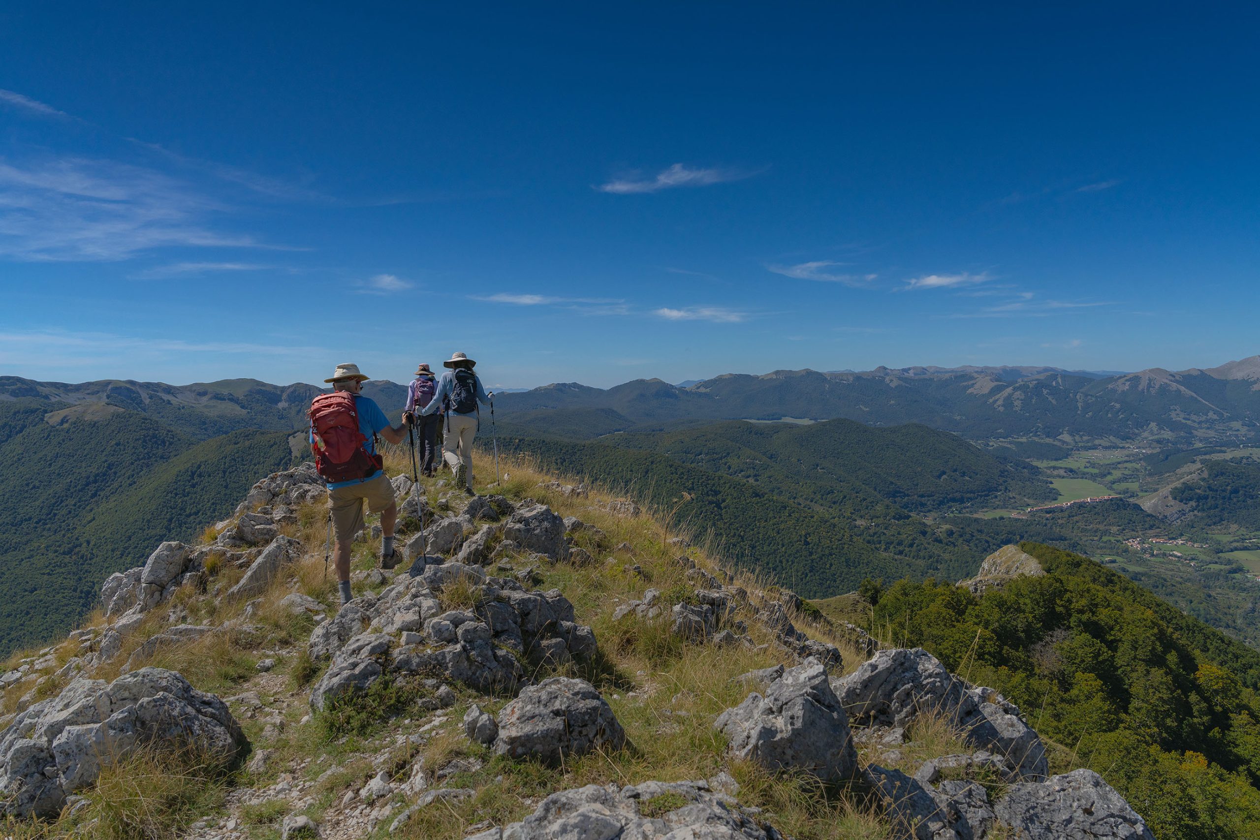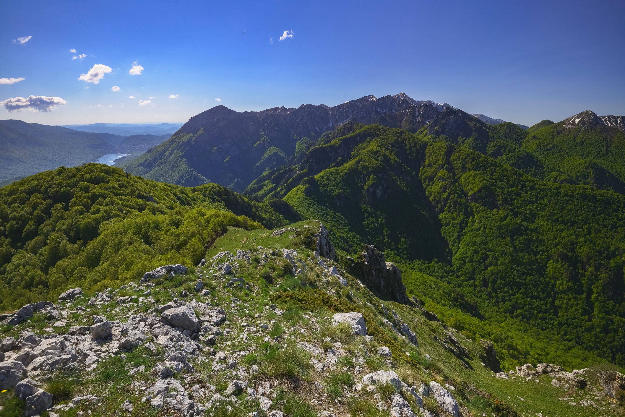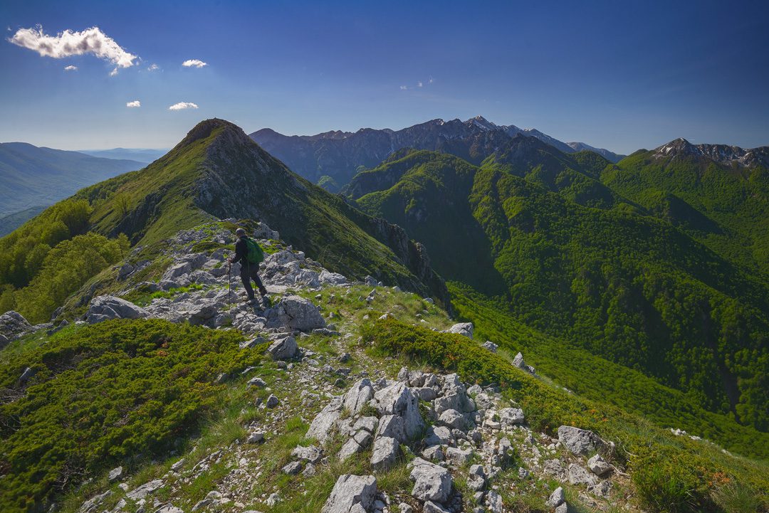 Da questo punto il sentiero segue la cresta della montagna. Raggiunta una prima cima, si ridiscende per pochi metri per poi risalire fino alla vetta a quota 1.862 m. Il panorama a 360 gradi è meraviglioso: il Monte Marsicano, il Lago di Barrea, l’inconfondibile profilo della Camosciara, la Val Fondillo con i suoi boschi rigogliosi da cui abbiamo iniziato la salita, i circhi glaciali della Serra delle Gravare e le vallate di Opi e Pescasseroli.
